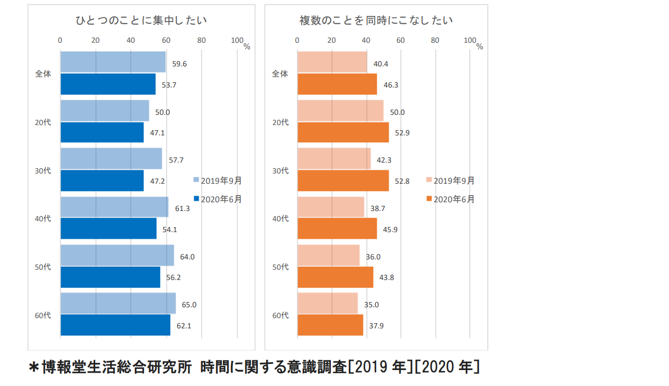 生活者はコロナ下のままゆっくり過ごしていきたいのかというと、結果は反対に生活速度を「高速化したい」生活者が、僅かながら増えているのです。特に、20代は70.5%、30代は68.0%が「高速化したい」と答えており、高速化欲求の強さが窺えます。また、下図「複数のことを同時にこなしたい」か「ひとつのことに集中したいか」という質問に対しても、コロナ前と比べて、すべての年代で「複数のことを同時にこなしたい」派が伸びており、20代、30代では半数を超えています。
