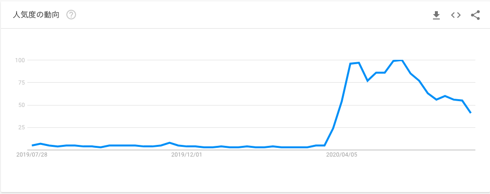週末に外出した際に街中を観察していても、3密を避けソーシャルディスタンスを保つことも、意識せずにできる新習慣として定着してきているように思います。Googleトレンドで「ディスタンス」というワードを検索してみても、コロナ禍に突入した3月以降爆発的に増加し、その後やや落ち着きを見せ始めていることがわかります。
