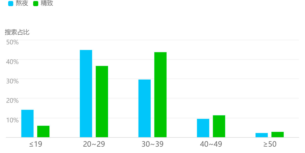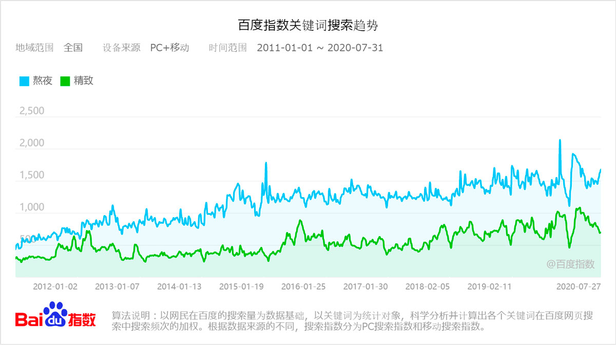 実際に、ここ10年近く、「夜更かし(熬夜)」や「精緻」への関心は、Baidu指数をみると、ともに高まりつつあることが見て取れます。20~30代は特に、その傾向が顕著です。