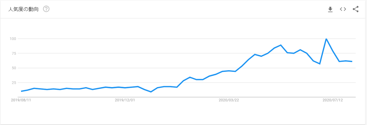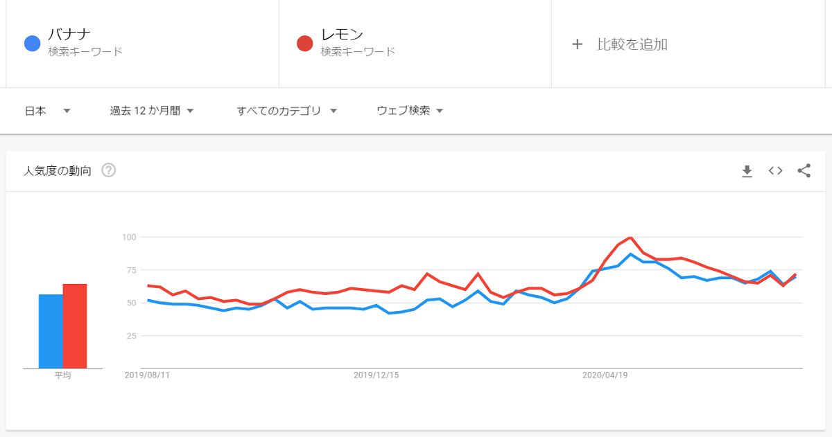 おうち時間が増えたことを機に、ミキサーやブレンダーを買って、朝いろんなフルーツのスムージーをつくるようになったと、私の周囲でよく聞きます。スムージーだけで朝食をすませているようですが、SNSや記事などでよく見るのがバナナスムージーです。Googleトレンドで見てもバナナの検索数が4月頃から増えていますね。エネルギー効率のよい果物としてそもそも日本人に人気ですが、このところさらに伸びているようです。ちなみに、レモンも注目されていて、検索数を比較すると、バナナとレモンは似たような波形を示していました。どうやらライバル関係のようです(笑)
