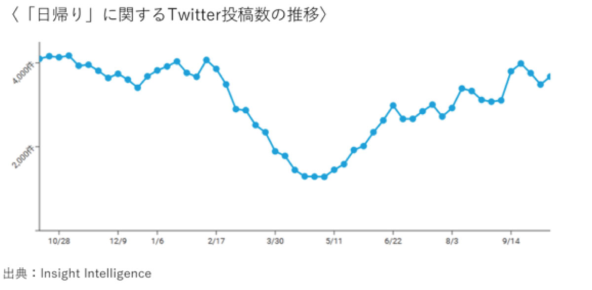 Background Locationが広がっている最大の理由は、コロナ禍におけるお出かけ事情の変化だと考えられます。海外はもちろん国内でも大きな旅行がしづらい中で、自宅からそう遠くない範囲で、新たに魅力ある場所を探すことへのニーズが高まっているのではないでしょうか。実際、博報堂のオリジナルツールでTwitterの投稿数を見ても「日帰り」という言葉の投稿が、緊急事態宣言の解除以降、右肩上がりで増加しており、多くの方が時間をかけて遠出せずとも、楽しい体験ができたことをSNSに投稿していることがわかります。
