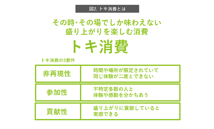 さらに、事象の共通点の分析から、時間や場所が限定されていて同じ体験が二度とできないという「非再現性」、不特定多数の人と体験や感動を分かちあうという「参加性」、盛り上がりに貢献していると実感できるという「貢献性」をトキ消費の3要件としました。