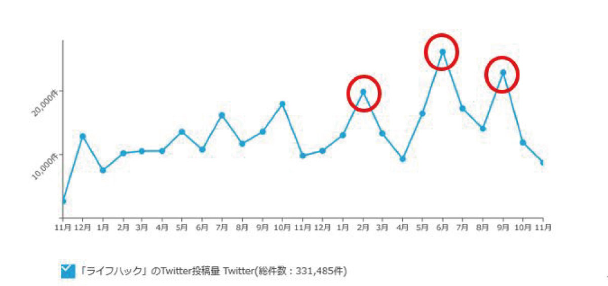 テンプレート(定型化)とライフを掛け合わせた造語でいわゆるライフハックの一種になりますが、時短や効率を追求して生活仕様をテンプレート化している人が、ここ最近増えてきているという話です。ライフハックという言葉も一般化し、書店やYouTubeなどでもよく見かけるようになってきましたが、実際、Twitterの投稿数の傾向を見ても、ここ最近で注目度が高まってきているテーマであることがわかります。