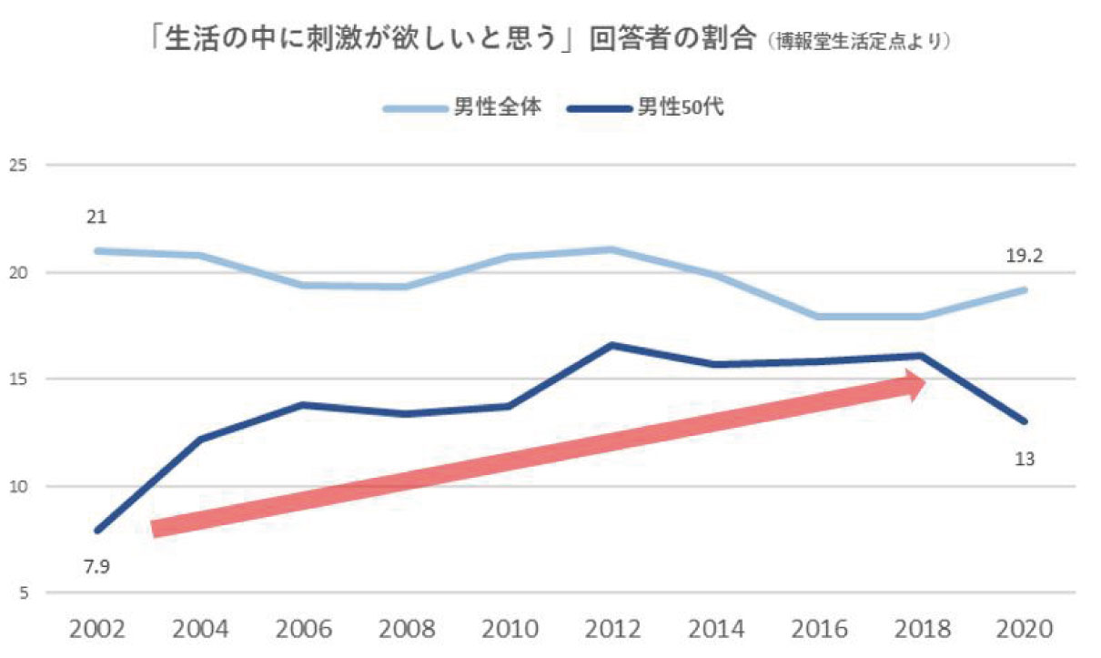 博報堂生活総合研究所の生活定点によれば、「生活の中に刺激が欲しいと思う」というスコアは、2000年代前半から、男性全体では大きく変わっていない一方で、50代男性のスコアが倍近くに増加しています。