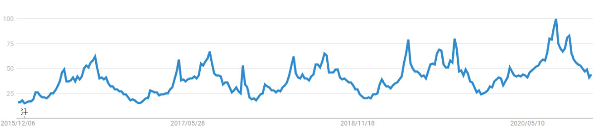 代表的なものでいえば、キャンプです。コロナ禍の影響もあり、改めてキャンプブームが女性の若年層を中心に広がっています。ここ5年のGoogleトレンドを見ても、キャンプの熱が全体として高まりつつあることが見て取れます。