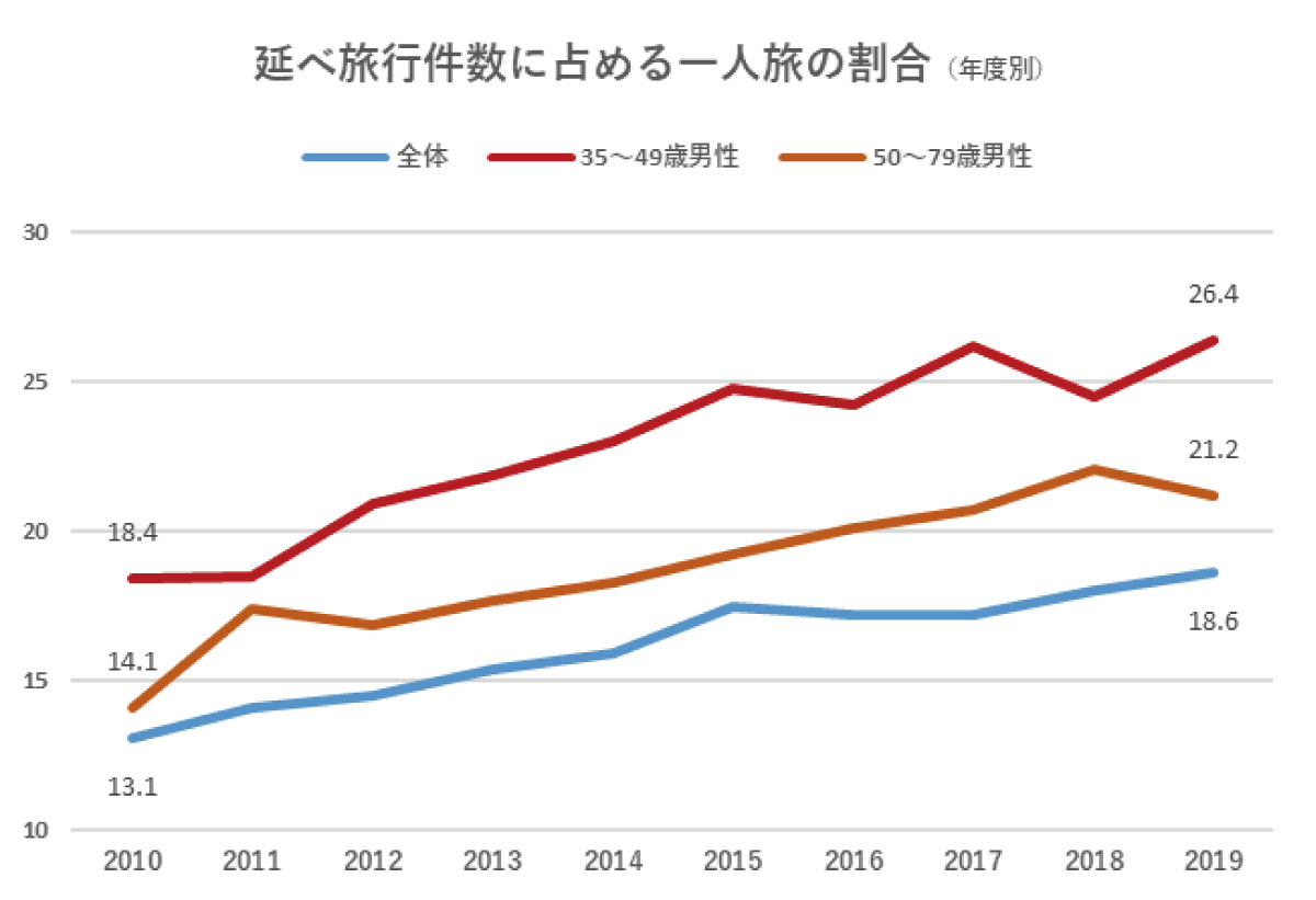 じゃらん宿泊旅行調査によれば、延べ旅行件数に占める一人旅の割合は、2010年度から2019年度にかけて、全体では5.5%の増加だったのに対し、35~49歳男性では8%の増加、また50~79歳男性では、7.1%の増加と、全体より増加率が高い結果となっています。