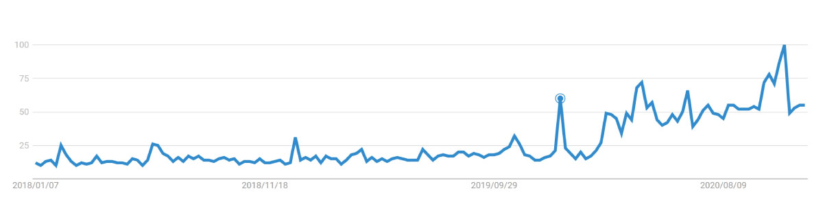 たとえば音楽業界では、ウイルス対策のためアーティストのライブや音楽フェスの公演キャンセルが続き、代わりに自宅でライブ体験を味わうオンラインライブが増えました。Googleトレンドで「ライブ配信」と検索してみると、2020年に入ってから検索数が大きく伸びていることが分かります。