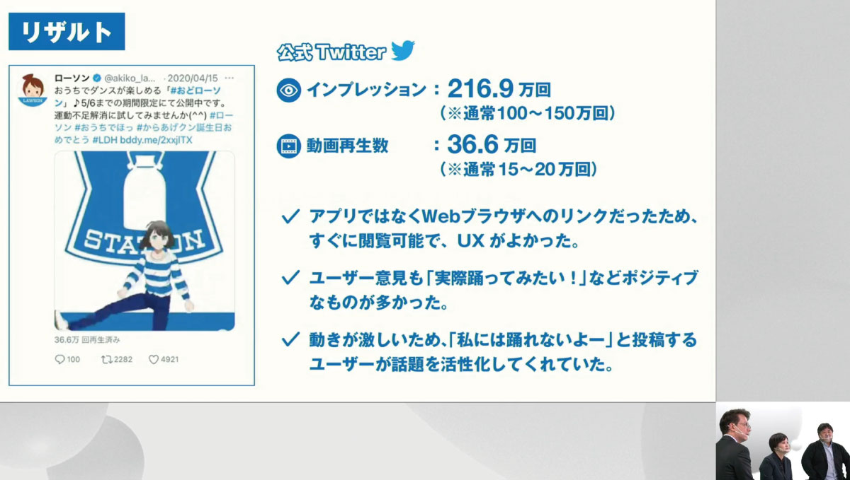 今回は530万人(2020年4月時点)ほどフォロワーがいる公式Twitterアカウントで告知し、インプレッション通常投稿の約4割増、動画再生数は倍近くに伸びました。定性的な印象としては、やはりアプリを入れずWeb上で楽しめるUXが受け入れられており、踊ってみたという声が多く見られました。ただ、実際の動きはプロのダンスなので、「私にはついていけない!」といった声や、それに対して友人が返答して話題にしている様子もありました。