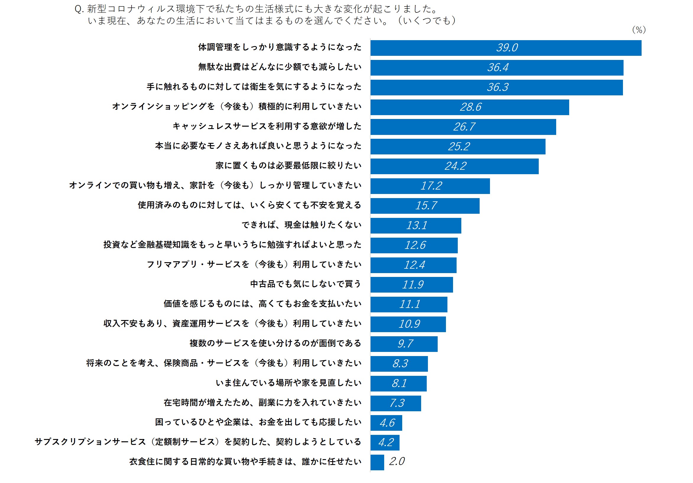 まず、コロナ禍における意識・行動について聞いたところ(図1)、「体調管理をしっかり意識するようになった」(39.0%)、「手に触れるものに対しては衛生を気にするようになった」(36.3%)など衛生面に関する項目が上位に挙がりました。