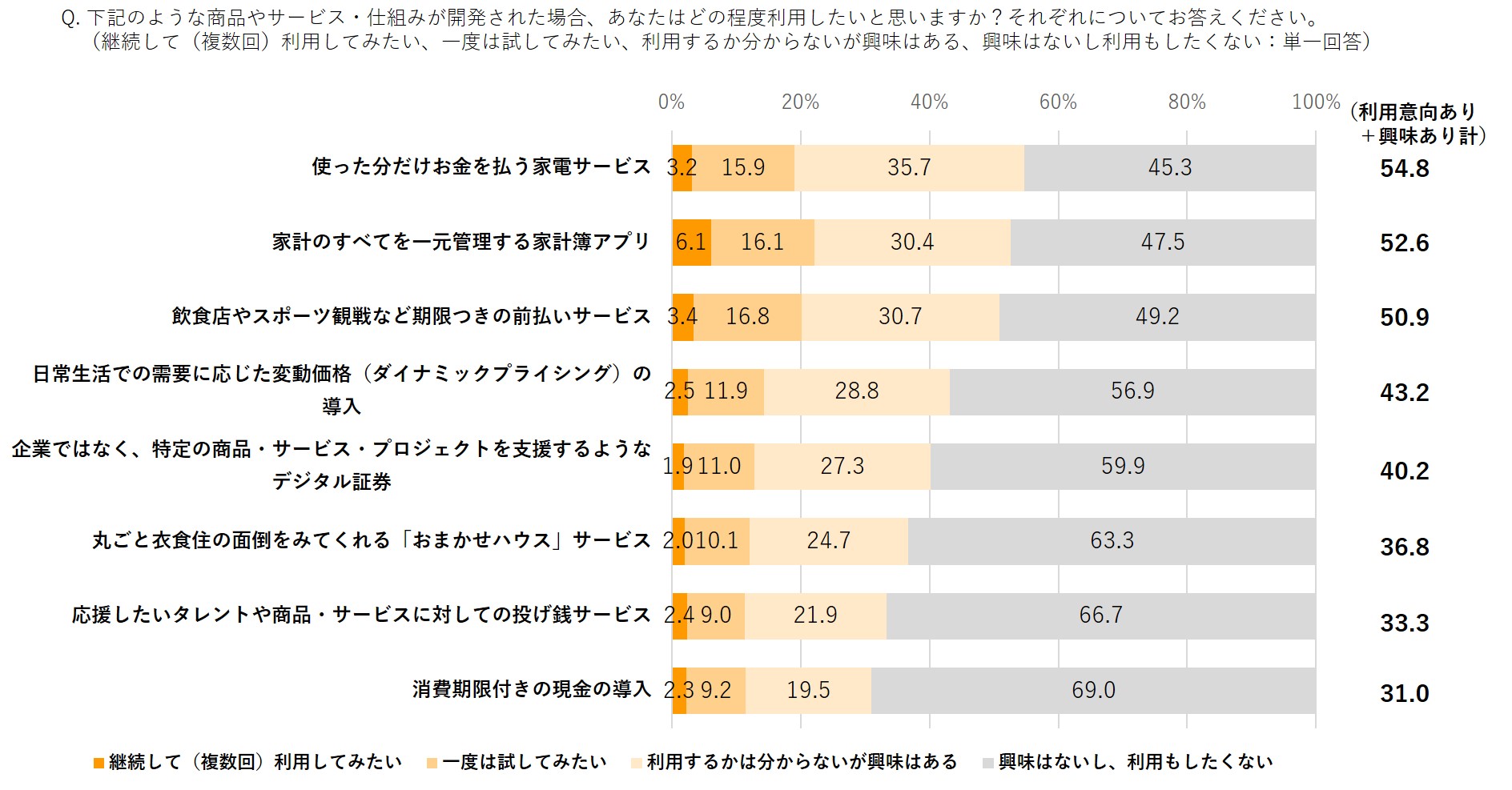 最後に、新しいフィンテック商品やサービスが開発された場合どの程度利用したいと思うか聞いたところ(図3)、「利用してみたい」もしくは「興味がある」と回答した人の合計が多かったのは、「使った分だけお金を払う家電サービス」(54.8%)と「家計のすべてを一元管理する家計簿アプリ」(52.6%)でした。最初にご紹介した生活者意識のデータで、「無駄な出費はどんなに少額でも省きたい」が2番目に高かったとご説明しましたが、まさに無駄を省きたいという気持ちの表れだと思います。