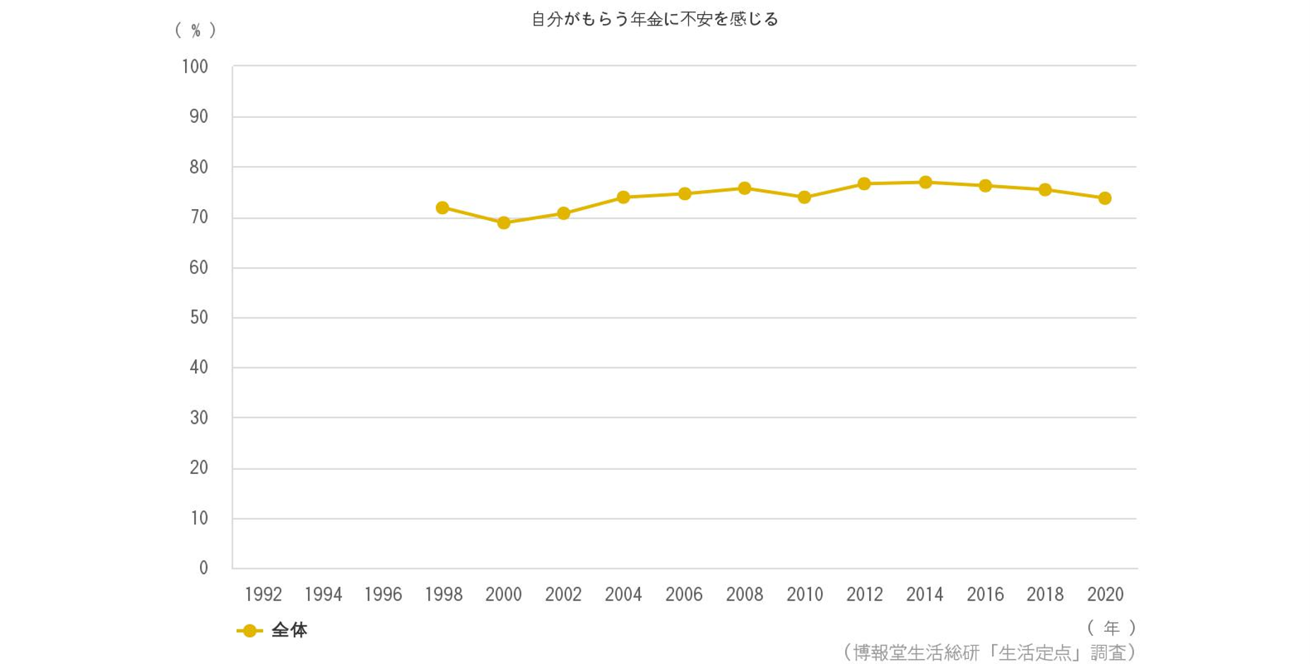 投資や金融に関する結果を見ると、「いろいろな投資情報に関心がある」と答えた人の割合は、98年には22.2%ありましたが2004年には10.5%まで下がり、その後は10%前後で推移しています。一方で「自分がもらう年金に不安を感じる」と回答した人は、1998年から一定して約7割いるんです。年金不安は20年以上経ってもまったく変わらない一方で、それを補うために投資への関心が高まっているかと言ったらそうでもない。また、「金融商品の良し悪しについて、自分なりに判断できる」と答えた人の割合は年々下がり続けていて、2020年には10%を切っています。