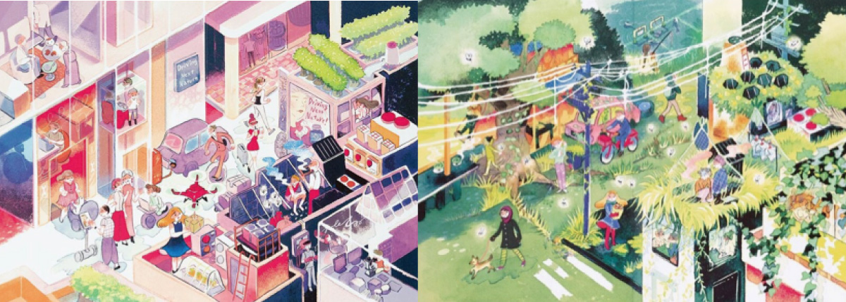 たとえばこの挿絵、左の絵はバイオテクノロジーに頼った未来で、右の絵は自然との協調と引き換えに文明は衰退する未来をそれぞれ描いたものです。こんな感じで対話を誘発するためのイメージビジュアルを、イシヤマアズサさんというイラストレーターさんと協力してたくさん作りました。