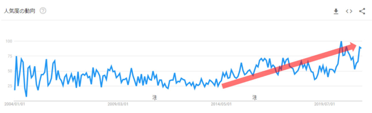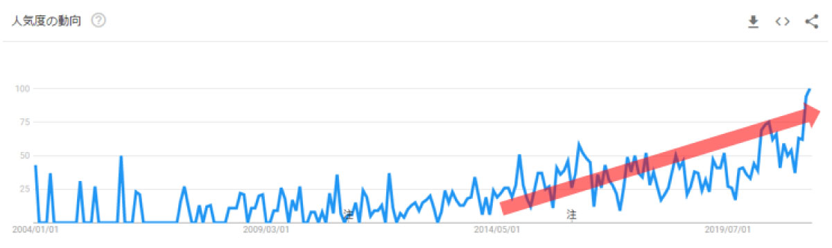 さて、今回のテーマは、「丸ごとEAT」です。果物や野菜を丸ごと食べることへの注目が高まっているのではないか?という話です。Googleトレンドで2004年からの推移をみてみると、「丸ごと」の検索量は、2015年ごろから上昇傾向にあることがわかります。