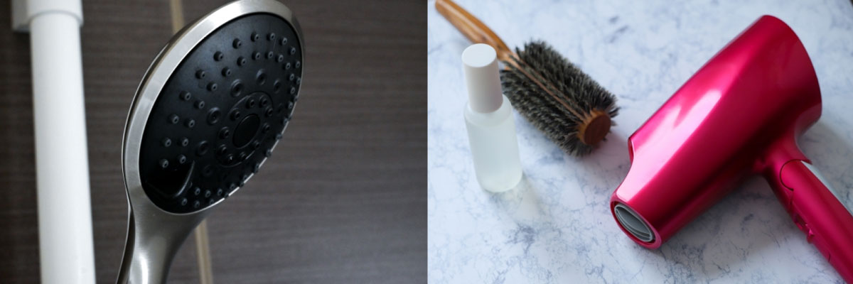 シャワーヘッドは本来シャワーの先端につけ水を分散して噴射し、身体を洗う際に使用するもの、ドライヤーは風を当てることで髪を乾かすものです。