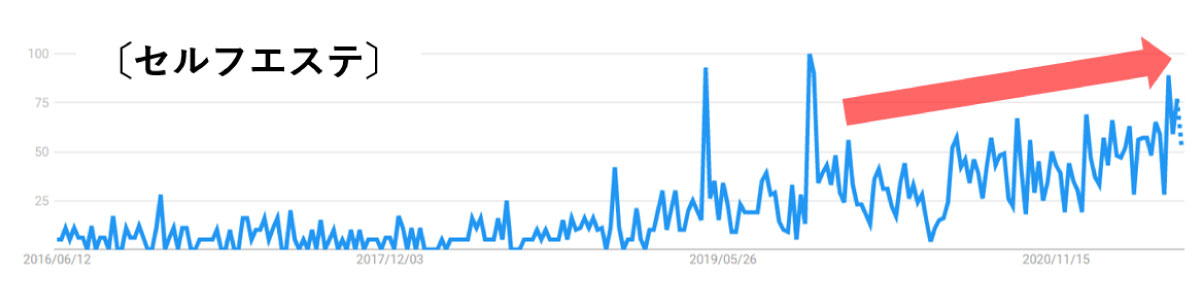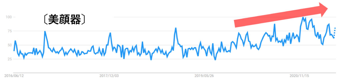 まずこちらのGoogleトレンドにおける「セルフエステ」「美顔器」の推移をご覧ください。