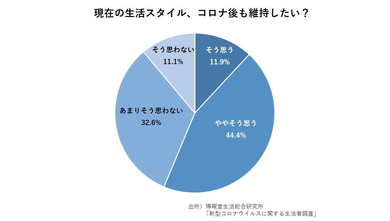 では、人はこう問われたらどう答えるだろうか。「今後、新型コロナウイルス感染への懸念がなくなったとしても、あなたは今の生活スタイルを維持したいと思いますか」。博報堂生活総合研究所が4月に実施した「新型コロナウイルスに関する生活者調査」(3大都市圏の20~69歳1500人対象)の中での質問だ。結果は「維持したい」が56.3%と過半数に達した。さまざまな自粛を強いられたコロナ禍での生活スタイルを生活者は必ずしも否定しておらず、それは私の予想を超える水準だった。