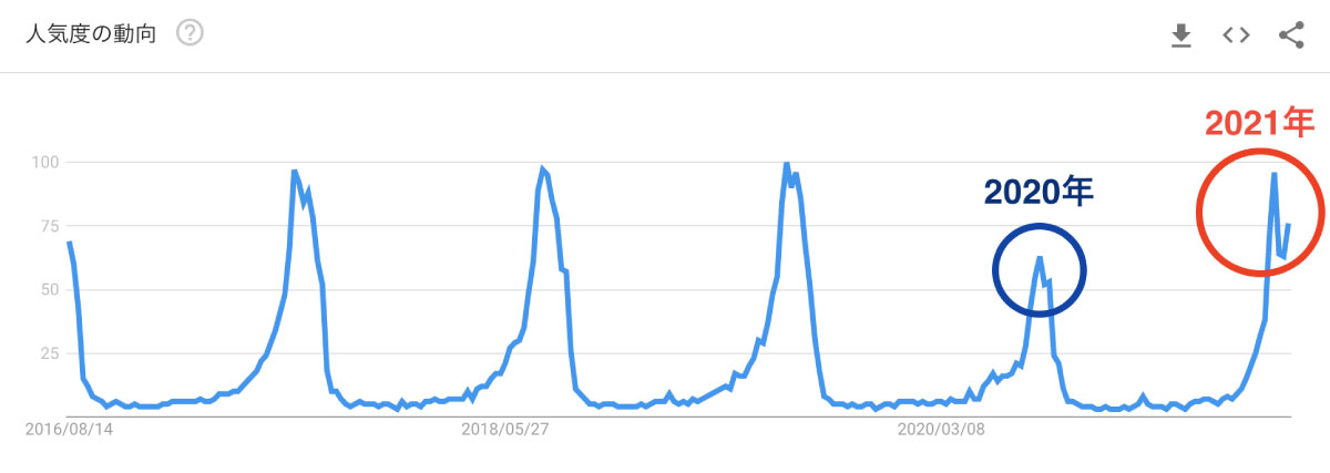 Googleトレンドの過去5年間における「夏休み」の検索数を見てください。例年に比べて昨年度は、自粛ムードの影響かスパイクが小さくなったものの、今年は例年並みに回復。多くの生活者が夏休みの過ごし方について、なにかしら模索している様子がうかがえます。