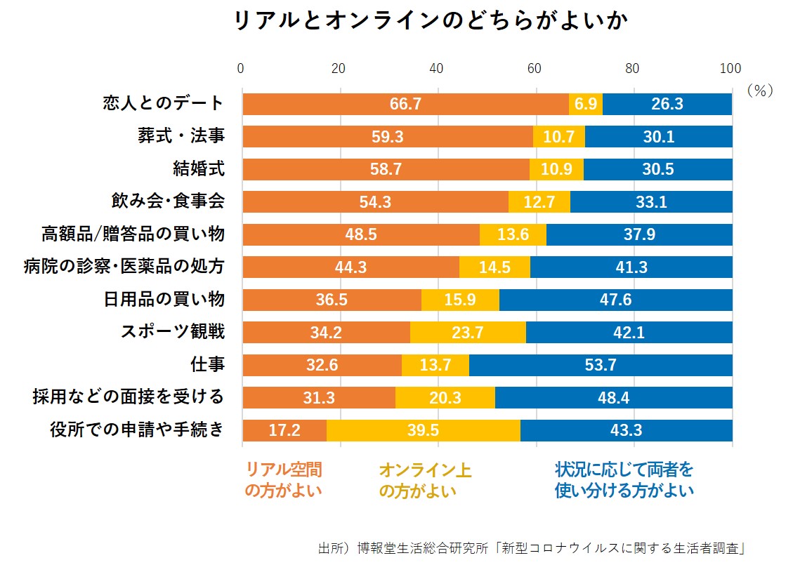 このほかにも、三密を避けるためにオンラインの結婚式や葬儀が行われていることを耳にした方も多いだろう。これら現状ではまだ萌芽(ほうが)でしかないことを含めた様々な事柄について、生活者は今後どうしたいのか。2021年3月の調査(三大都市圏の20~69歳)で、「リアル空間の方がよい」「オンライン上の方がよい」「状況に応じて両者を使い分ける方がよい」の3択で答えてもらった。結果は「結婚式」はリアル派58.7%、オンライン派10.9%、使い分け派30.5%となった。「葬式・法事」についても同じような数値だ。
