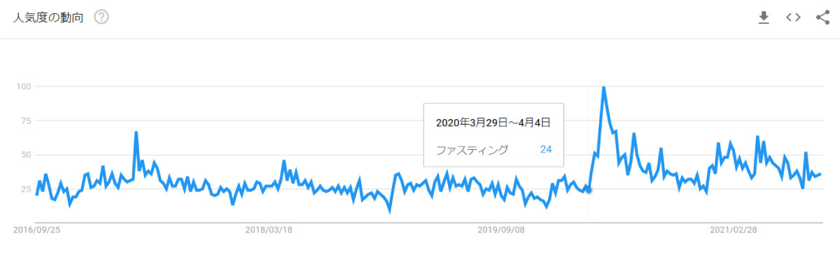 今回のテーマは「あれこれファスティング」です。最近よく聞くこのファスティングという言葉、日本語では「断食」ですね。私の周りでもプチ断食をしたという人がちらほら。そんなファスティングという考え方が食以外にも様々な分野に広がっているという話です。まずは、Googleトレンドで「ファスティング」を検索してみると、一回目の緊急事態宣言が発令されたあたりから一気に伸びて、その後も高い検索数を維持しているのがわかります。