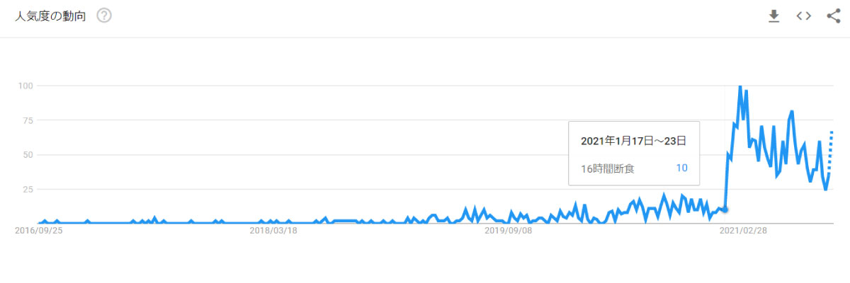 では、具体的にどんなファスティングが広がっているのでしょうか。まずは、言葉の通り断食の意味のファスティングです。このところ私の周囲でも広がっているのが「16時間断食」です。最後にご飯を食べてから、翌日の最初の食事までの間を16時間空ける断食のこと。ただ一定時間食べないだけで誰でも気軽に実践しやすいということで、ダイエット目的で実践している人が多いようです。Googleトレンドで見ても、今年に入って一気に検索数が高まっていますね。