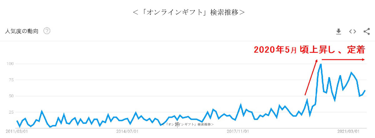 今年3月にヒット習慣予報 vol.161『デジプレ』で検索数が大きく伸びたとお伝えした「オンラインギフト」のキーワードを再度検索すると、5月まで検索数の伸びは続き、その後は落ち着いたものの高止まりしており、オンラインでギフトを送る行為が習慣化、一般化しつつあることがわかります。