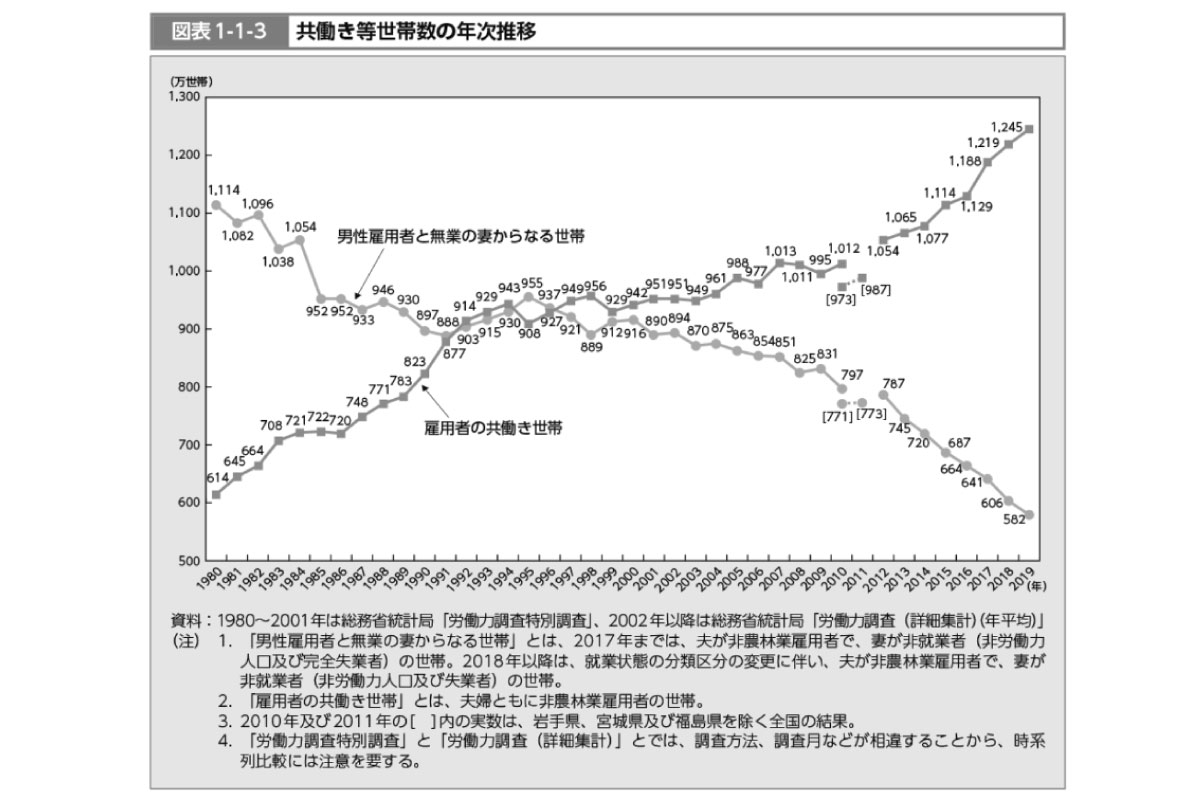 まず、現在の家庭状況を調べてみると下記の表を見てもわかるように共働き家庭はどんどん増え、パパの協力が不可欠な状況が見て取れます。