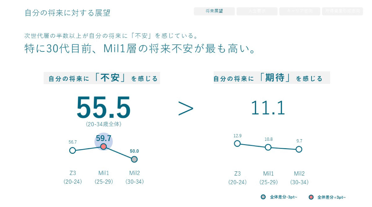 まず特徴的だったのが、そもそもこの世代は将来に期待を感じていないということです。「自分の将来に『期待』を感じる」と答えた人はわずか11.1%だったのに対し、「自分の将来に『不安』を感じる」人は55.5%いて、中でも30代目前の25~29歳の層が最も高く、59.7%に上りました。