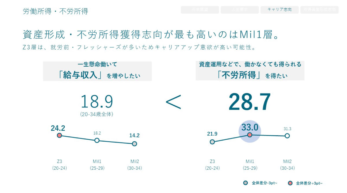 「給与所得」と「不労所得」に対する意識を聞いたところ、20~24歳の就職したばかりの世代は「一生懸命働いて、給与収入を増やしたい」意欲が他の年代より高めですが、それ以降になると「資産運用などで、不労所得を得たい」と考える人の方が多くなることがわかります。