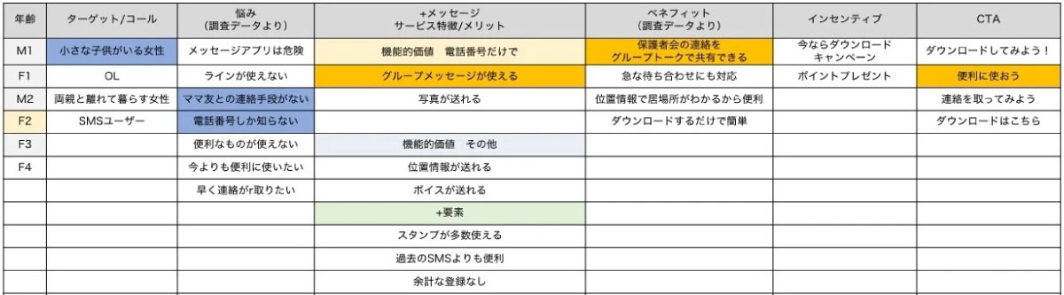 伝わる動画を目指し、動画の構成は、ターゲット、悩み、サービスの特長やメリット、ベネフィット、インセンティブ、行動喚起(CTA)など要素を分解して考えています。それぞれの要素を羅列して整理しておくと、「今回準備している動画の組み合わせ」も一目瞭然。クライアントとも共有しやすく、合意も取りやすい。そして「次はこのターゲットと、この悩み、このベネフィットを組み合わせて・・・」といった具合に、作り直しもしやすくなります。