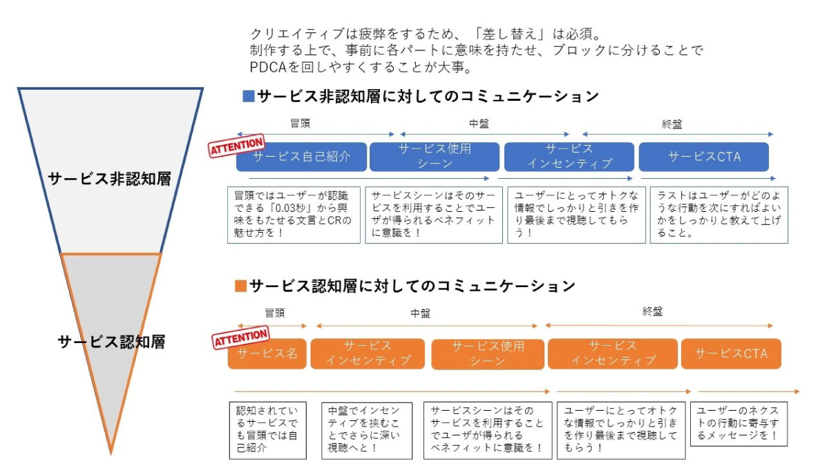 PDCAを回しやすくするために、ターゲットごとに、冒頭、中盤、終盤の各シーンをブロックに分けて考えています。例えば、サービスを知らない人には、まず「サービスの紹介」から始まり「使用シーン」「インセンティブ」「CTA」という順番にする。一方、サービスを知っている人には、冒頭に「サービス名」をいれて、「インセンティブ」「使用シーン」「インセンティブ」「CTA」という流れにする。同じ動画でもシーンのブロックを入れ替えることで、ターゲットにあった内容にアレンジできるのです。