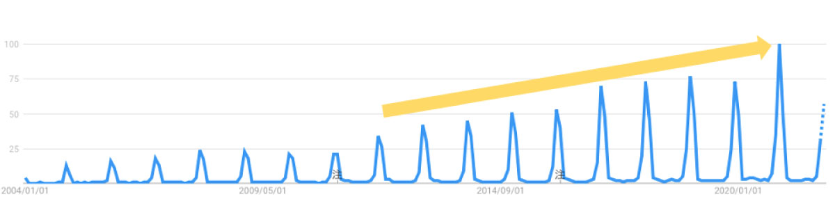 買い物にも”計画的偶然”高まりの兆しが見られます。時期が限られる話ではありますが、以下は「福袋」の検索トレンドになります。毎年、福袋が一斉に売り出される年始にヤマが出来ていますが、全体として検索トレンドが上昇傾向にあることが分かります。ECサイトがこれだけ発達し、必要なものだけをすぐに買うことができる現代において、「欲しいものが手に入る一方で、欲しくないものも手に入る可能性がある」福袋が注目されているとは、意外な結果です。またまた個人的な話にはなりますが・・・実は昆虫飼育が趣味であることから、昆虫ショップの「クワガタ福袋」を毎年購入しております。特に欲しいとは思っていなかった種に愛着が湧き、結局一番のお気に入りになる、といった経験をこれまでに多くしてきました。笑 デパート、書店、ラグジュアリー等、福袋で同様の経験をされた方も多いのではないでしょうか。