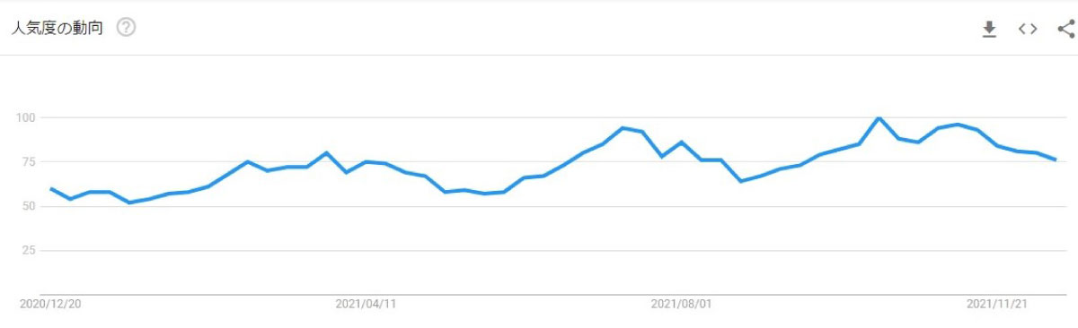 旅行についてGoogleトレンドで調べてみると、継続的に検索されつつ、やはり緩やかに上昇していることが分かります。