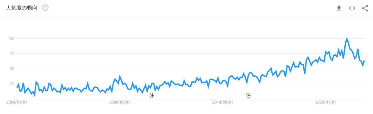 さてお正月と言えばお年玉、というわけでもないですが、新年一発目はお金に関するテーマです。名付けて「なんでもマネタイズ」。お金の稼ぎ方が多様化しているという話です。コロナ禍でリモートワークが広がり、またあらゆる手段がデジタル化される中、意外なお金の稼ぎ方が増えているようです。Googleトレンドで「副業」というキーワードを見ると2015年くらいから上昇トレンドに転じています。がっつり稼ぐというよりは、お小遣い稼ぎ程度のニーズが高まっているのかもしれません。