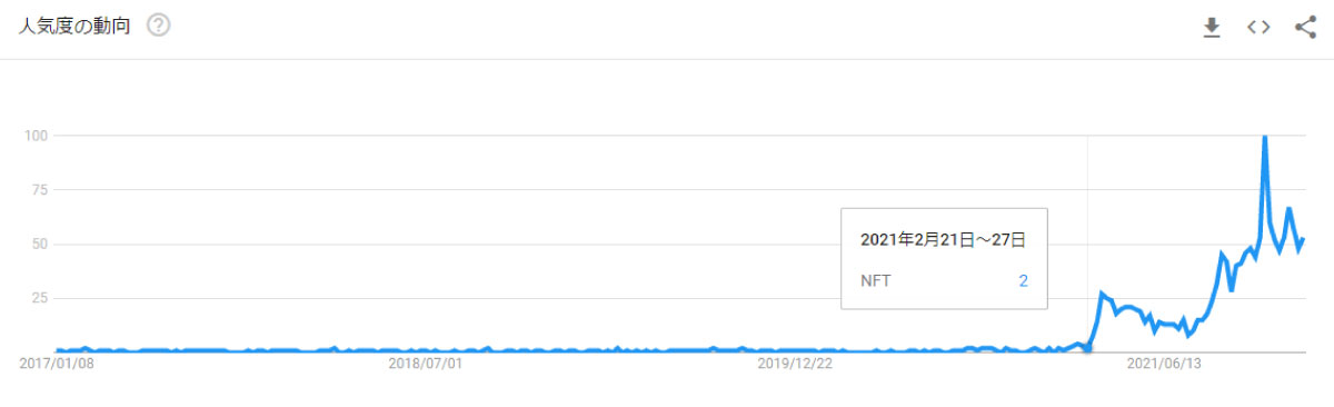 Googleトレンドで見ると、NFTというキーワードが2021年から急激に伸びています。小学生が描いた絵がNFTで高額取引されたというニュースを見た方も多いでしょう。NFTとは、ブロックチェーン技術を使ったデジタル資産の一種で、画像や音声などのデジタルデータを唯一無二のものとして商品化できる技術です。著名なアーティストが、自ら演奏した楽曲を1音ごとにNFTで販売して即完売したのも話題になりました。デジタルデータであればなんでもNFTにできるので、今後も意外なものがどんどんNFTマーケットで取引されるようになることが予想されます。