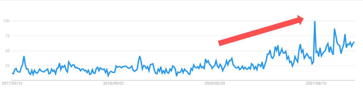 まずは、「ナイトキャップ」です。ナイトキャップとはその名の通り、睡眠時にかぶる帽子のことなのですが、 Google トレンドで見てみると、ここ数年でじわじわと注目されてきているのがわかります。