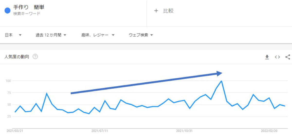 では、なぜこういった気軽に挑戦できるものづくり体験がいま人気を集めているのでしょうか?まず「手作り」と「簡単」を一緒に調べている人がここ一年で上昇傾向にあることから、できるだけさくっと楽しみたいというニーズがあることが分かります。