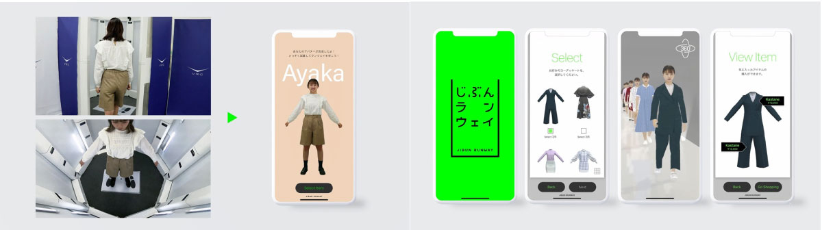 永野:まず、ボディスキャンの専用筐体で自分の3Dアバターをつくります。その後はスマホのアプリのみで操作可能です。「じぶんランウェイ」のアプリにラインアップされているコーディネートの中から好みのものを選び、ランウェイへGOすると、その選んだコーディネートを着た自分が続々とウォーキングして登場します。360°自由に視点移動できたり、複数の中から確認したい自分にフォーカスしたり、比較して見たり、バーチャルならではの試着が体験できます。気に入った洋服があれば、より詳細の情報を閲覧でき、最終的には各ブランドのECに遷移し購入するという流れを想定しています。