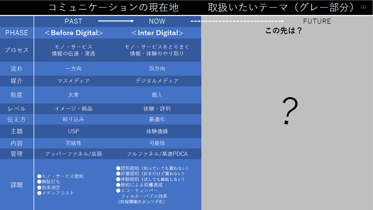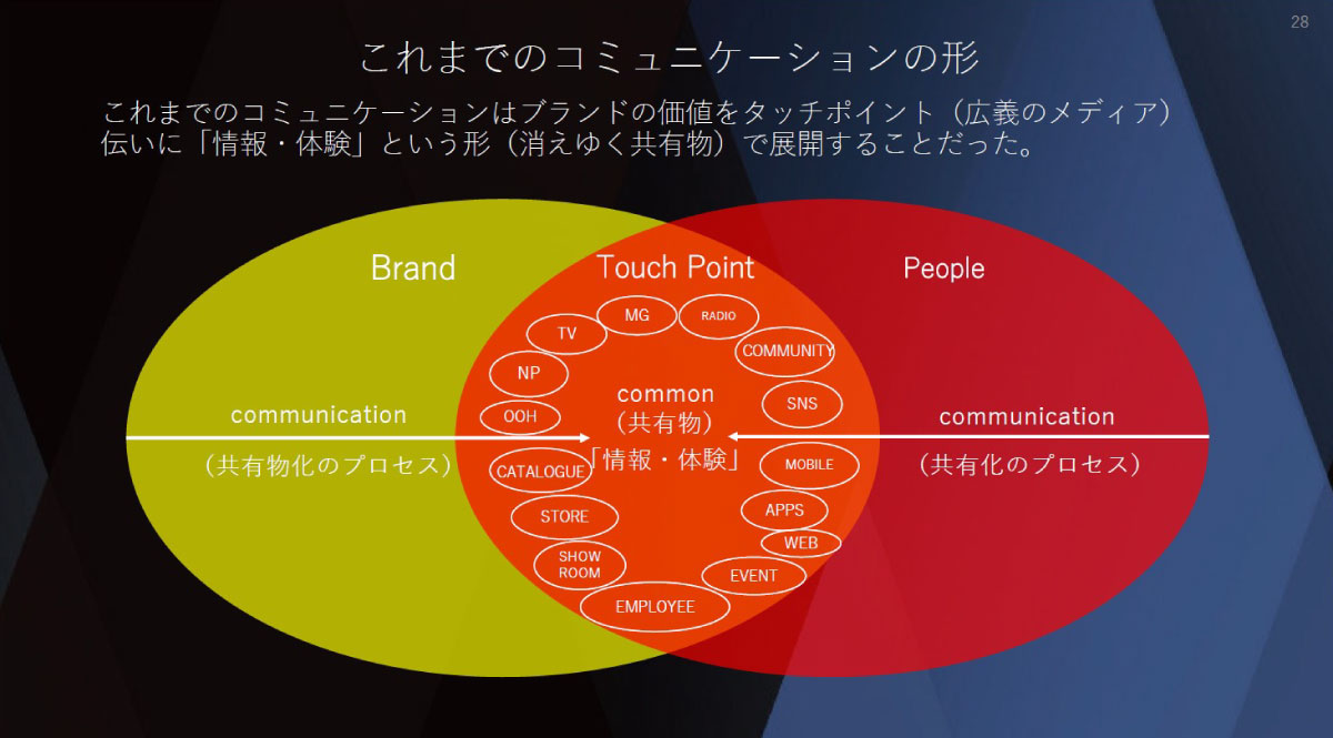 これまでのコミュニケーションの形とは、さまざまなタッチポイントを通じてブランドの価値を生活者と共有物化していくプロセスのことだったと言えるのではないかなと思います。