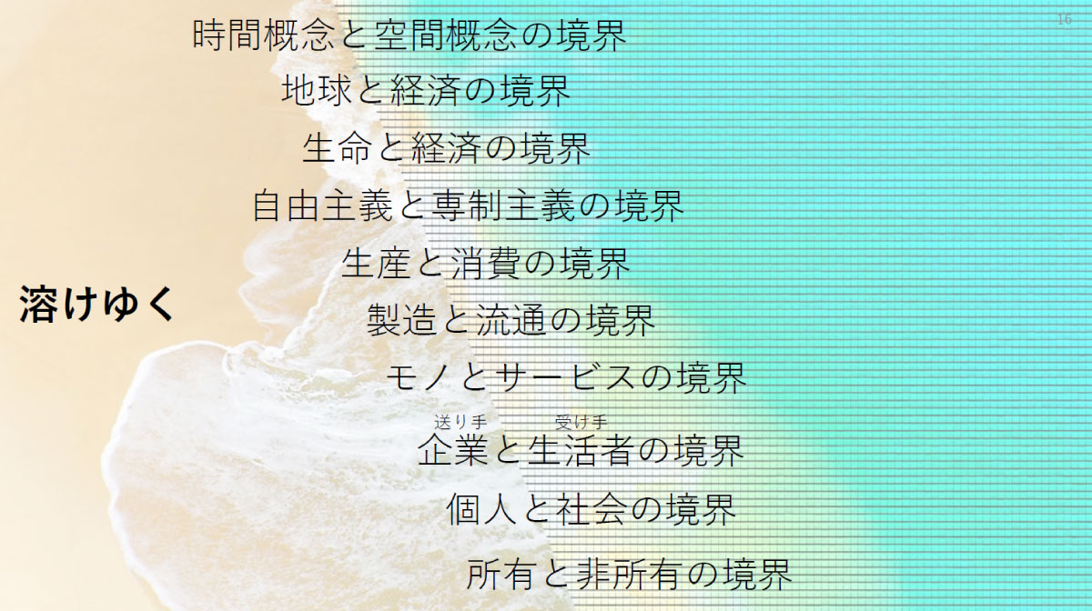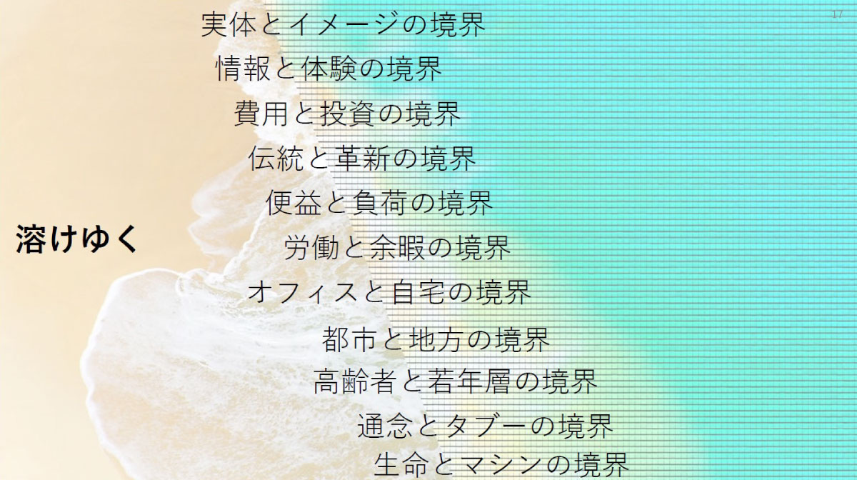 たとえば「時間と空間」の境界。「生命と経済」の境界。ほかにも「物とサービス」、「企業(送り手)と生活者(受け手)」、「所有と非所有」、「個人と社会」、「実態とイメージ」──。本当にあらゆる境界がデジタル化によって溶かされつつあります。コロナ禍以降は、オフィスと自宅の境界も溶けていますよね。