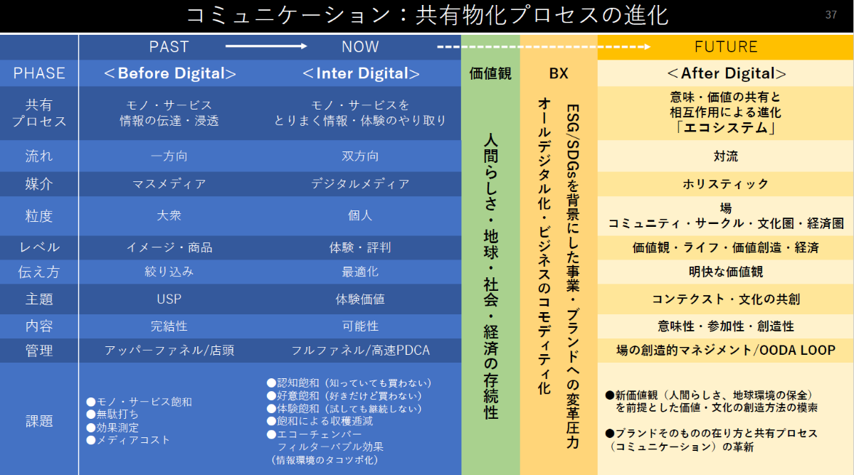 ここまでの話を踏まえて、図1の右側の「未来」、アフターデジタルの部分を埋めたのが図4になります。人間らしさ、地球環境の保全などの新しい価値観を前提としたとき、価値や文化をどう創造していけばいいのかなど、課題はたくさんあります。それでも、共有物化のプロセスとしてのコミュニケーション、エコシステムとしてのコミュニケーションを何らかのかたちで実践していくことが、アフターデジタルの世界におけるブランドのあり方として求められていくのではないかと私は考えています。