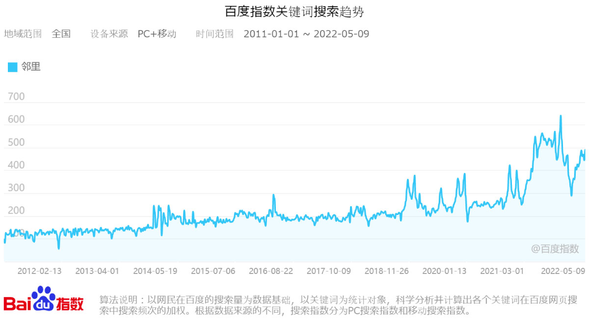 近年、特に工薪族(=サラリーマン)世帯が多い都市部では、地域にいる時間が少ないため、大都市ほど住んでいる地域における人と人との関わり合いが薄れてきていますが、隣近所に住む人との関わり方を見つめ直す動きも高まっています。ここ10年間でBaidu指数をみると、「邻里(=隣近所)」への関心は、特にコロナ流行後、一段と上昇していることが見て取れます。