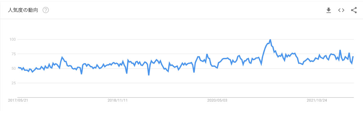 そんな自分の金融リテラシーの遅れを取り戻すべく、今回は「子どものお金英才教育」と題し、今後盛り上がってくるであろう子どもへの金融教育の最前線について、ご紹介したいと思います。そもそも、子どもの金融教育が巷で注目されている背景には、今年の4月から高校の家庭科で金融教育が必修となったこともありますが、「老後2000万円問題」などのニュースをきっかけに、若年層を中心に金融意識が高まっていることが大きいかと思います。Googleトレンドで、ここ5年間の「投資」の検索動向を見ると、緩やかながら上昇傾向にあり、自身の資産形成はもちろん、子どもに対しても金融リテラシーの必要性を感じ始めているのかもしれません。