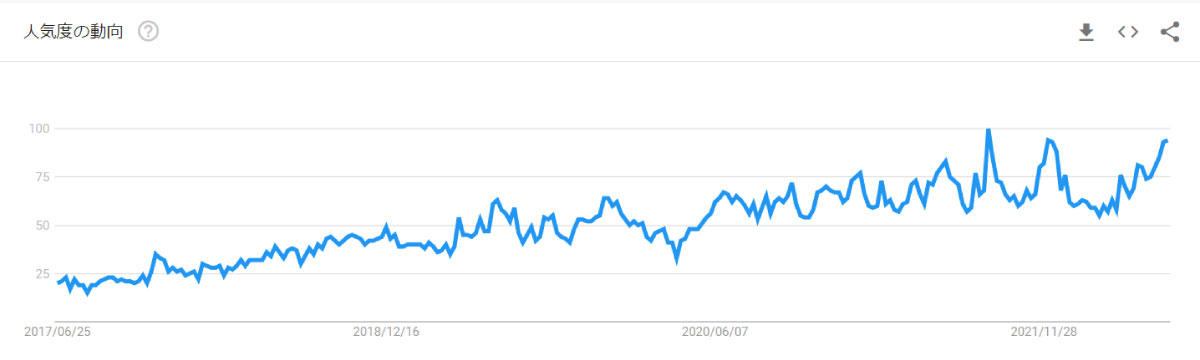 私も最近使い始めたのですが、これはすごいです。歩数、消費カロリー、心拍数などが可視化されます。その中で私が一番重宝しているのが睡眠の質診断です。「深い眠り」と「浅い眠り」を判別し、スコア化してくれるので、その日の睡眠がよかったのかどうかが一目瞭然です。私はもともと眠りが浅い体質なのですが、今話題の睡眠の質を向上してくれる飲料を飲んだら、驚くことに「深い眠り」の割合が向上したのです。本当に因果関係があるのかは定かではないですが、行動に対して指標の変化が見えるは面白いですよね。ちなみにこの「スマートウォッチ」、検索数も上昇トレンドにあり、注目を集めていることがわかります。ちなみにスマートウォッチと連携できるスマート体組成計もとてもいいです。体重、体脂肪率、内臓脂肪、基礎代謝、タンパク質の量など、体のあらゆるスコアが可視化され、ついつい同年代スコアより劣っている項目を改善したくなってしまいます。