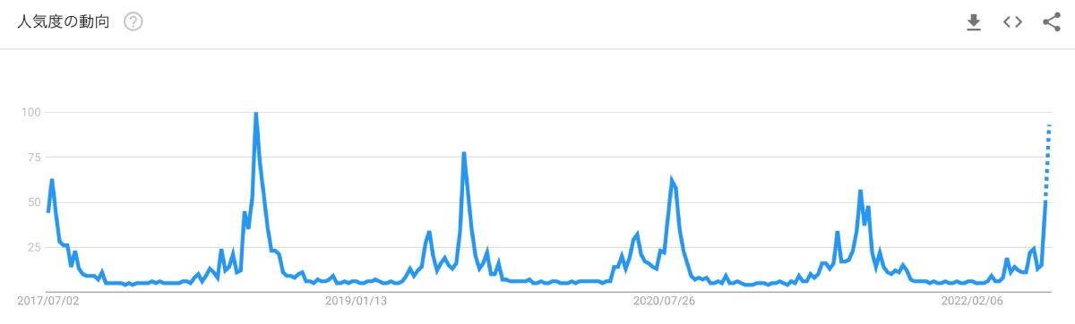 まず今年は「歴史上最も早い梅雨明け」「記録的猛暑の夏となるだろう」等と語られますが、人々の意識はどうなっているのでしょうか?生活者の皆さんの端的な思いであろう「暑い」で検索をかけてみると今年の夏は過去5年間でトップクラスの反応を見せていました(一部グラフが点線なのは最新のデータが部分的なためです)。ちなみに同レベルで高い2018年は「2018年の猛暑」とも呼ばれ、東日本の平均気温が平年を1.7度上回り1946年の統計開始以来最も高い平均気温を記録した年です。下記のグラフは7月3日に検索したものですので、2022年は7月頭の時点で既に「2018年の猛暑」と同じくらいみなさんが「暑い」と感じているということになります。