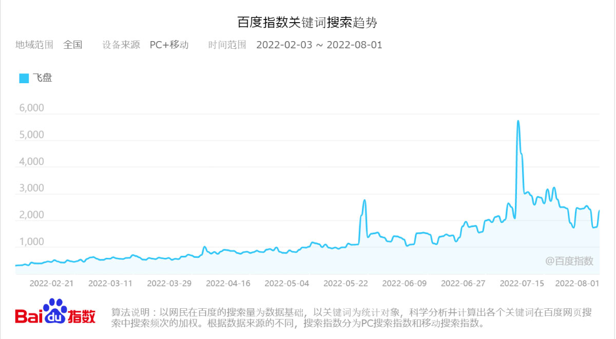 1年前まではめったに聞かない種目でしたが、「フライングディスク(中国語で“飛(フェ)盤(パン)”)」という検索ワードをBaidu指数で調べてみると、下記のように今夏に入ってにわかに人気を集めていることが見て取れます。