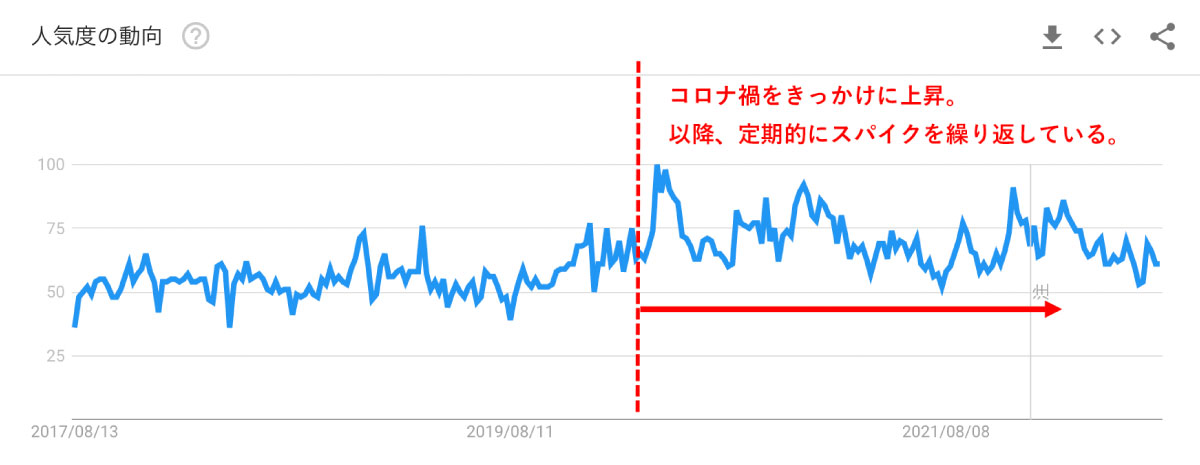 実際、Googleトレンドで「プロジェクター」の検索動向を見ると、コロナ禍をきっかけに検索数は高まりを見せ、以降も定期的にスパイク(急上昇)を繰り返しています。コロナ禍以前と比較しても、全体的な注目度も高まっていることがうかがえます。