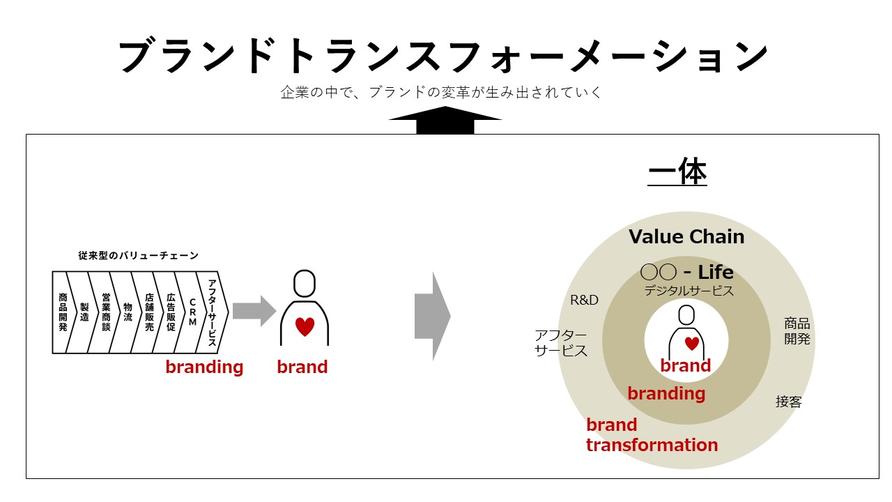 今までのバリューチェーンは企業が作ったものを生活者に届けて、生活者側でブランドのイメージが作られていく構造でした。今後は次の図の右側のような、企業と生活者・生活が「一体」になったバリューチェーンへと変化するのだと思います。企業活動の中に生活者が入り込み、生活の中に企業が入り込んで、一緒にブランドの変革を起こしていく。これがBXのもう一つの大事な視点だと思います。