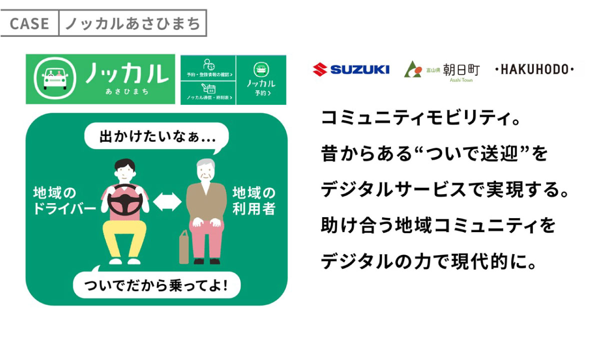 実は我々博報堂でも、生活者インターフェースの考え方から、さまざまな価値創造の取り組みを進めています。一つ具体例としてご紹介したいのが、「ノッカルあさひまち」というMaaSのサービスです。