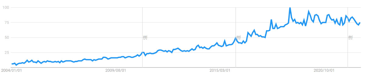 実際、Googleトレンドで「イヤホン」と検索してみると、年々検索数が伸び続け、コロナ禍以降では定着しているトレンドであることがわかります。生活の中でもイヤホンは必須アイテムになっているなあと改めて感じます。