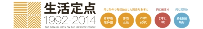 株式会社博報堂のシンクタンク「博報堂生活総合研究所」(以下「生活総研」所長:嶋本達嗣)は、22年間にわたり隔年で実施してまいりました生活者意識の定点観測調査『生活定点』を無償一般公開(フリーダウンロード、二次利用可能)いたしました。『生活定点』調査とは、1992 年から 22 年間にわたって隔年で実施している生活総研のオリジナル定点観測調査です。同じ地域(首都圏・阪神圏)、同じ対象者設定(20~69 歳の男女)に向けて、同じ質問を継続して投げ掛け、その回答の変化を時系列で観測しています。 項目数は約 1,500 項目に及び、衣、食、住、健康、遊び、学び、働き、家族、恋愛・結婚、交際、贈答、消費、情報、メディア接触、社会意識、国際化と日本、地球環境など、生活者のありとあらゆる領域を網羅しています。